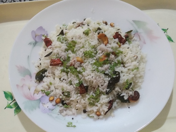 ಅಕ್ಕಿ ತೊಳೆದು ಅನ್ನ ಮಾಡಿ ಇಟ್ಟುಕೊಳ್ಳಿ. ತುಪ್ಪ ಬಿಸಿ ಮಾಡಿ, ಗೋಡಂಬಿ, ಒಣ ದ್ರಾಕ್ಶಿ ಹುರಿದು ತೆಗೆದಿಡಿ. ಅದೇ ತುಪ್ಪದಲ್ಲಿ ಸಾಸಿವೆ, ಜೀರಿಗೆ, ಕರಿಬೇವು, ಇಂಗು ಮತ್ತು ಒಣ ಮೆಣಸಿನ ಕಾಯಿಯನ್ನು ಮುರಿದು ಹಾಕಿ ಹುರಿಯಿರಿ. ಉದ್ದಿನ ಬೇಳೆ, ಕಡಲೇ ಬೇಳೆ ಕಾಲು ಬಟ್ಟಲು, ಮತ್ತು ತೆಂಗಿನ ಕಾಯಿ ತುರಿ ಸೇರಿಸಿ ಹುರಿದು ಒಲೆ ಆರಿಸಿ. ಉಪ್ಪು ರುಚಿಗೆ ತಕ್ಕಶ್ಟು ಸೇರಿಸಿ. ಹುರಿದ ಗೋಡಂಬಿ, ಒಣ ದ್ರಾಕ್ಶಿ ಸೇರಿಸಿ ಇನ್ನೊಮ್ಮೆ ಕಲಸಿ. ಮಾಡಿಟ್ಟ ಅನ್ನ ಸೇರಿಸಿ ಚೆನ್ನಾಗಿ ಕಲಸಿ. ಇದರ ಮೇಲೆ ಸ್ವಲ್ಪ ತೆಂಗಿನ ತುರಿ ಮತ್ತು ಕತ್ತರಿಸಿದ ಕೊತ್ತಂಬರಿ ಸೊಪ್ಪು ಹಾಕಿ ಅಲಂಕಾರ ಮಾಡಿ. ಈಗ ತುಪ್ಪದ ಅನ್ನ ಸವಿಯಲು ಸಿದ್ದ.
